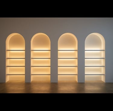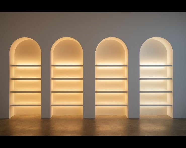 Lokole, tavane të varura, rafte dhe dizajne moderne me ndriçim LED — për një ambient elegant dhe bashkëkohor.